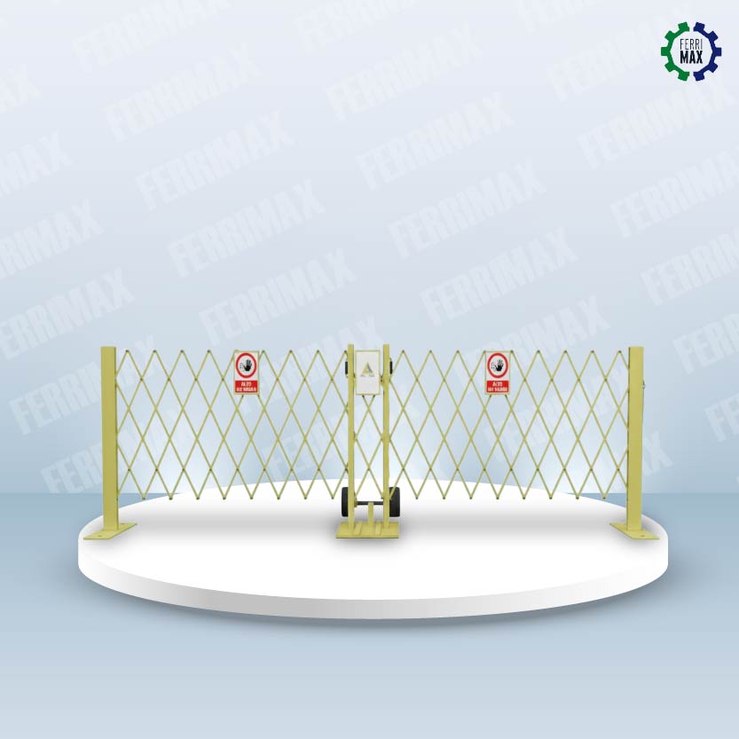 La Reja de Protección Retráctil con pedestal consiste en un dispositivo para delimitar áreas , compuesto de elemento arquitectónico de metal fabricado con una forma y figura especial tipo tijeras, usado como cerramiento para proteger o separar espacios en las áreas de operación donde existan maquinarias y/o equipos robustos en funcionamiento continuo que impliquen un riesgo para una persona que transite por la vía de operación,